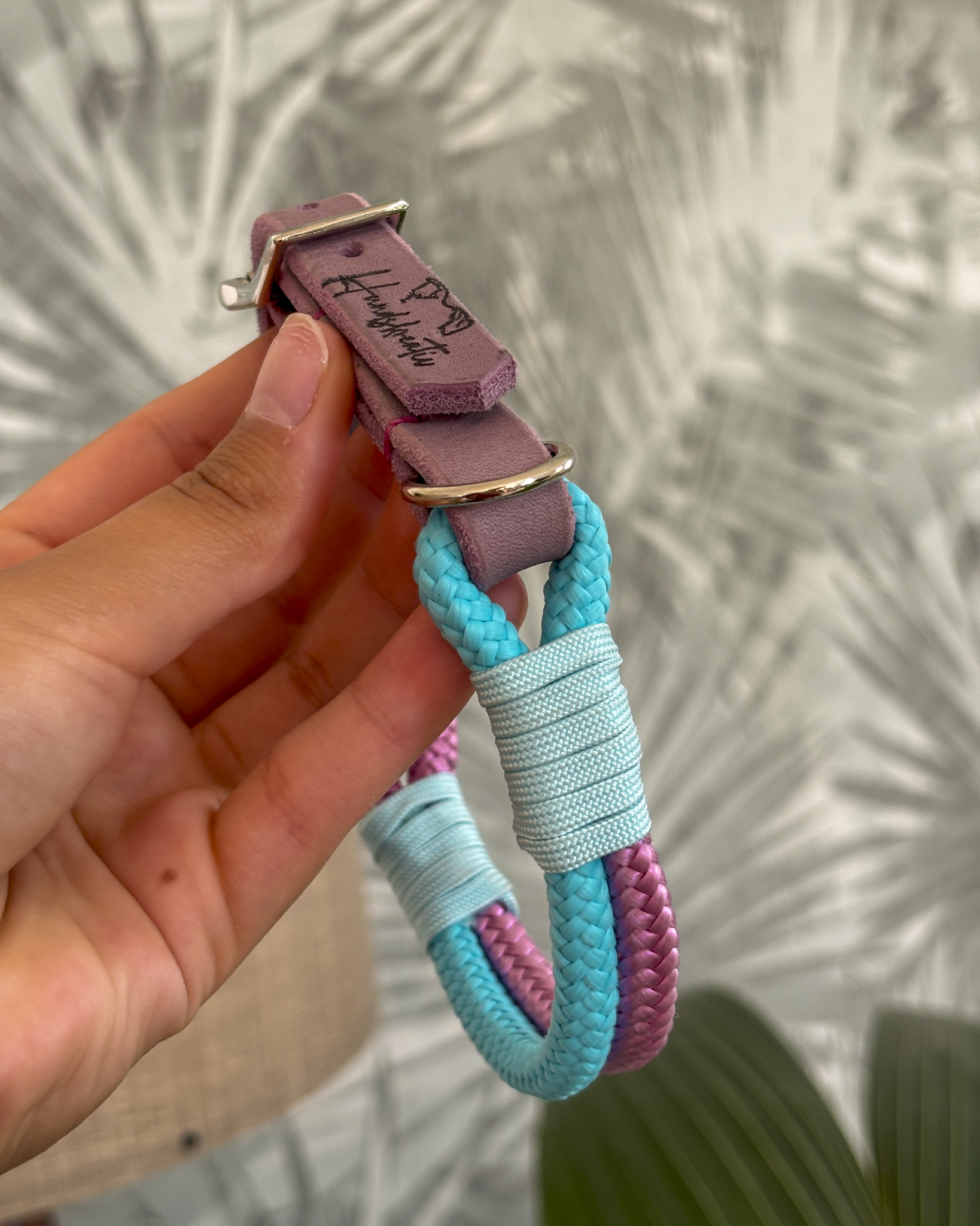 Dieses handgefertigte Hundehalsband aus Tau überzeugt mit einer außergewöhnlichen zweifarbigen Optik: oben Rosa, unten Hellblau. In Kombination mit dem verstellbaren Adapter aus Fettleder in Flieder entsteht ein harmonisches und zugleich modernes Design.