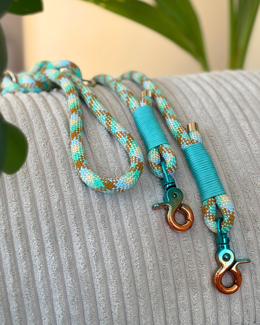 Die handgemachte Tauleine für Hunde ist ein farbenfrohes Highlight für deine Spaziergänge. Das Besondere: die mehrfarbigen Karabiner mit einem wunderschönen Farbverlauf von Blau zu Kupfer. Sie verleihen der Hundeleine eine trendige und einzigartige Note.